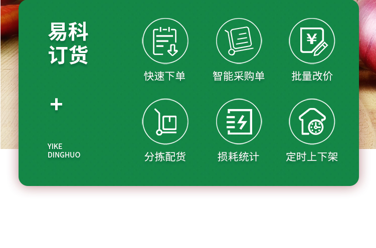 生鮮訂貨環(huán)節(jié)多、流程繁瑣,如果還采用傳統(tǒng)的抄寫、保存、核對的方式,不僅費(fèi)時(shí)費(fèi)力,還容易出現(xiàn)錯(cuò)漏,財(cái)務(wù)數(shù)據(jù)也難以監(jiān)管,出現(xiàn)錯(cuò)漏也無法責(zé)任到人,這樣是不利于商家發(fā)展。現(xiàn)如今大家也都體會(huì)到了,手機(jī)下單有多方便?客戶打開微信隨手一點(diǎn)即可下單,商家即可配送。易科訂貨歡迎您的咨詢...