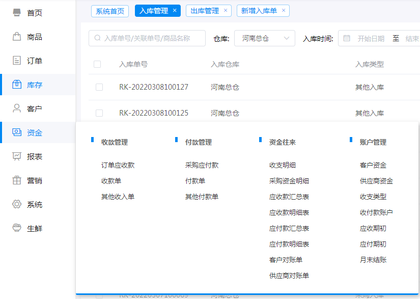 ①入庫匯總頁面,顯示商品的入庫總數(shù)和總?cè)霂旖痤~,便于與供應(yīng)商輕松核對賬目。“查看方式”有兩種:選擇“按商品查看”,能通過入庫均價,了解某段時期供應(yīng)商對商品提供的平均供貨價,方便對商品定價;選擇“按入庫類型查看”,展示某供應(yīng)商各個分類的入庫金額以及總的入庫金額,篩選后,入庫分類條目清晰,便于企業(yè)掌握某類商品具體入庫情況。